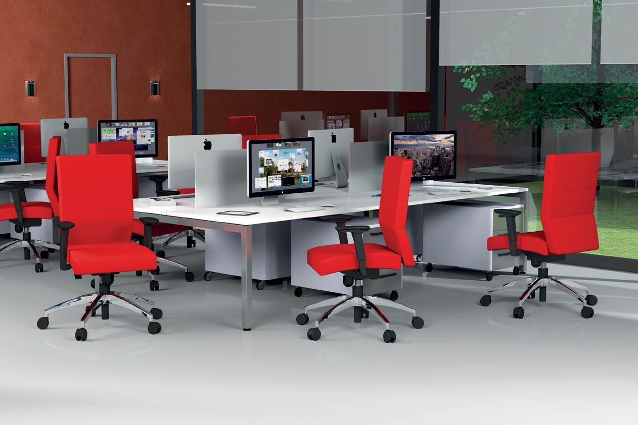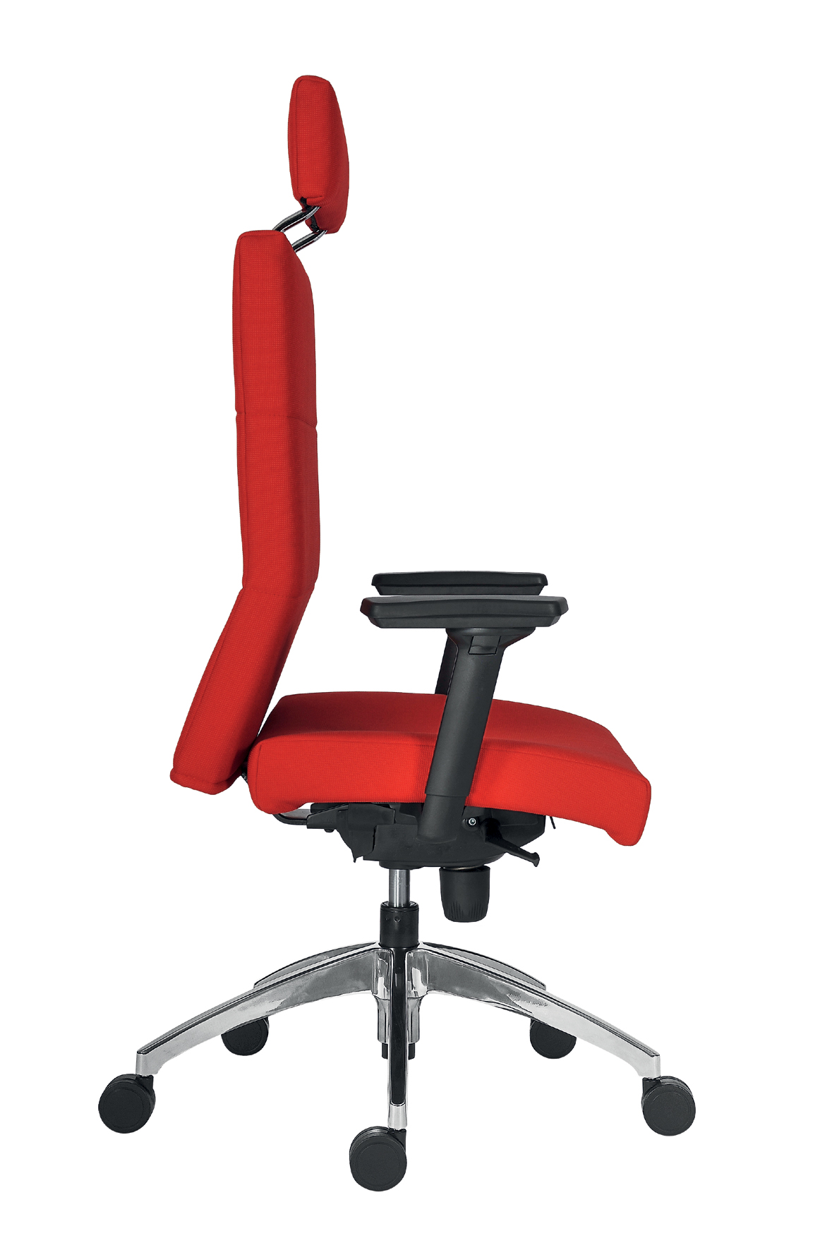 Kancelářské křeslo se středně vysokým opěrákem. Synchronní mechanismus s pětinásobnou aretací a možností nastavení síly protiváhy, moderní kvadratický tvar čalounění respektující současně ergonomická zakřivení, nastavení výšky plynovým pístem. Výškově nastavitelné područky se třemi funkčními nastaveními, kolečka s větším průměrem, aluminiová leštěná báze, prošívané čalounění.